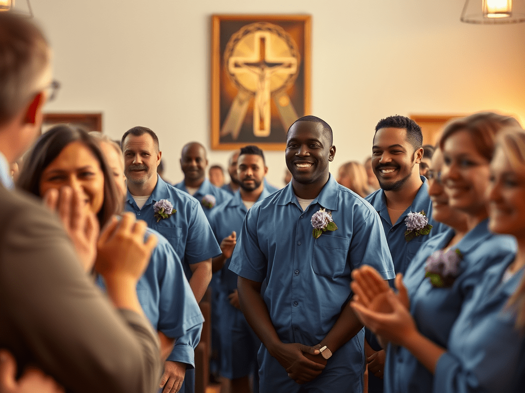 The church decided to invite the inmates who had worked hard on the renovation project and offer them a dinner of appreciation and encouragement. Wearing their neatly pressed blue uniforms and freshly shaved, the inmates entered the fellowship hall prepared by the congregation, looking a bit shy and awkward. As they stepped through the doorway, we rose to our feet and greeted them with applause. Then we pinned on their chests small lilac boutonnieres—buds just beginning to bloom.