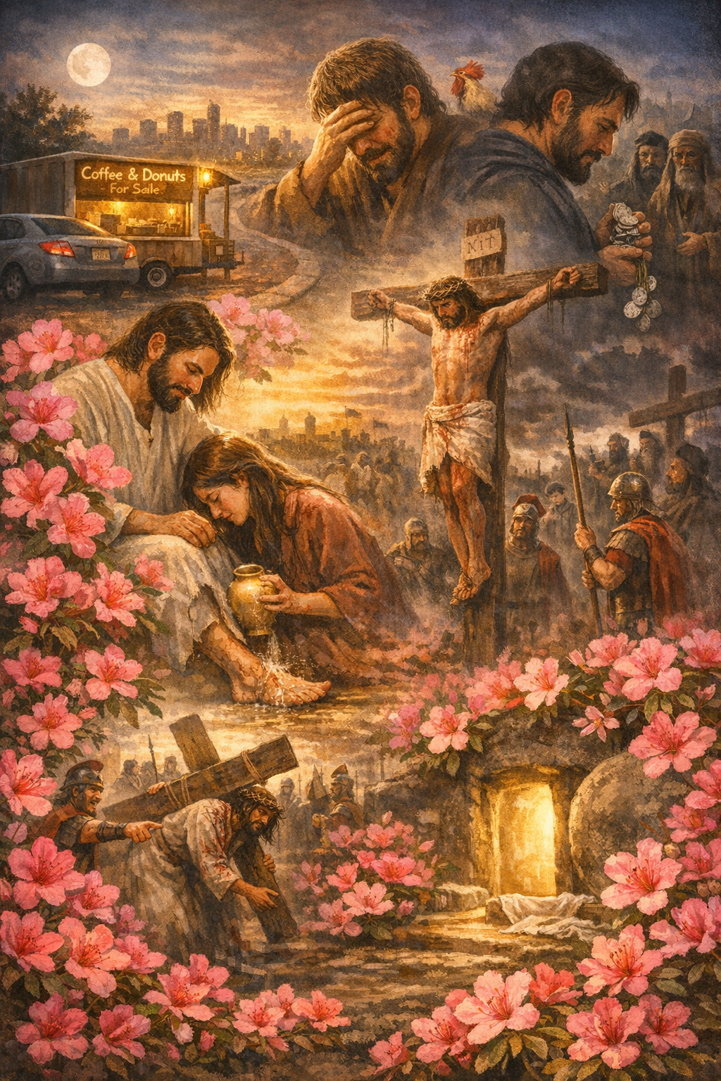 In the cry of “Hosanna!” Peter, with shoulders wide, laughed boldly, as if the road to Jerusalem were a path to glory. He held the donkey’s reins with pride, leading the way for his Lord. But before the rooster crowed, he bore the ache of defeat alone to meet the dazzling day.