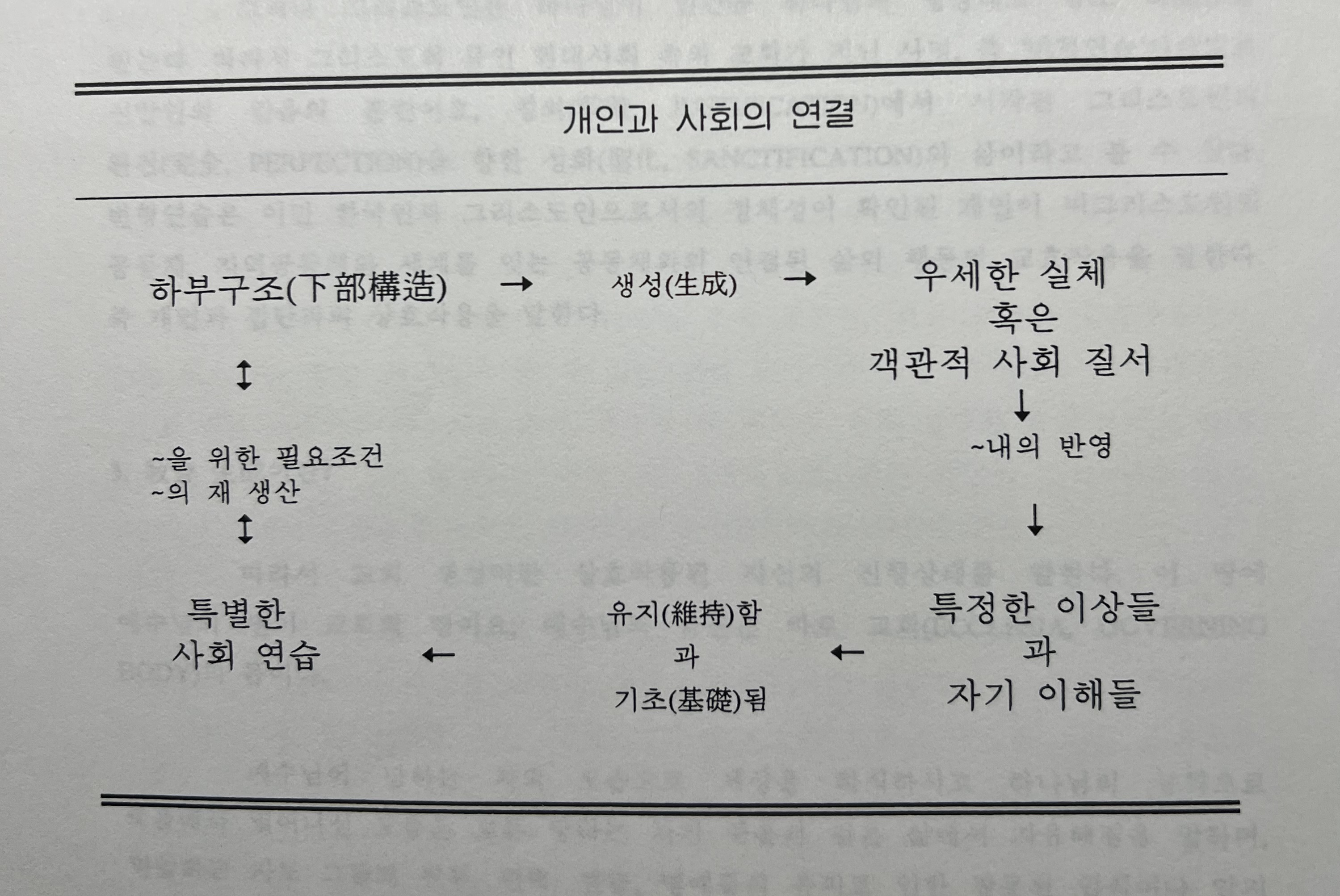 Peter L. Berger는 그의 책 Facing Up to Modernity 에서 다음과 같이 말하면서 개인(個人)과 체재(體栽) 사이의 관계를 간단하게 요약해주고 있다. “사회는 신비로운 힘인 개인과 부딛친다. 즉 개인이란 그의 삶을 형성해 가는 근본적인 힘의 무의식이다.”(46) 이는 다른 말로 표현한다면, 개인 자신의 실체란 관계 속에 존재한다고 볼 수 있다. 사회는 개인들의 의식적이고도 의도적인 행위로 부터 전적으로 유출되었다기 보다는, 사람들 사이에서 상대적으로 자율적인 반면 서로 관계를 참아나감으로 유출된다. 사회는 그래서 인간 주체의 변형하는 행위를 향해 개방되여 있음을 알 수 있다. 사회적 자유화와 변형은 생산과 재 생산의 형태와 사회적 관계들의 조직적 성격을 알도록 추구해야만 하고 또한 이를 견뎌 나감을 진술해야 만한다. 사회는 경험과 이성적 조사를 통한 심각한 반영과 지식의 객체가 될 수가 있으며 재 생산될 수 있을 뿐만 아니라 수정되기도하고 더욱이 인간의 행위나 실천(연습)을 통해서 변형될 수가 있다. 실천(연습)은 구체적인 상황 속에서 자의식(自意識, SELF-CONSCIOUS)과 자성(自省, SELF-CRITICAL ACTIVITY)의 행위로 부터 일어나는 앎(KNOWING)과 행함(DOING)의 한 길이다. 그러므로 실천(연습)은 반사적으로 된 행동인 것이다.