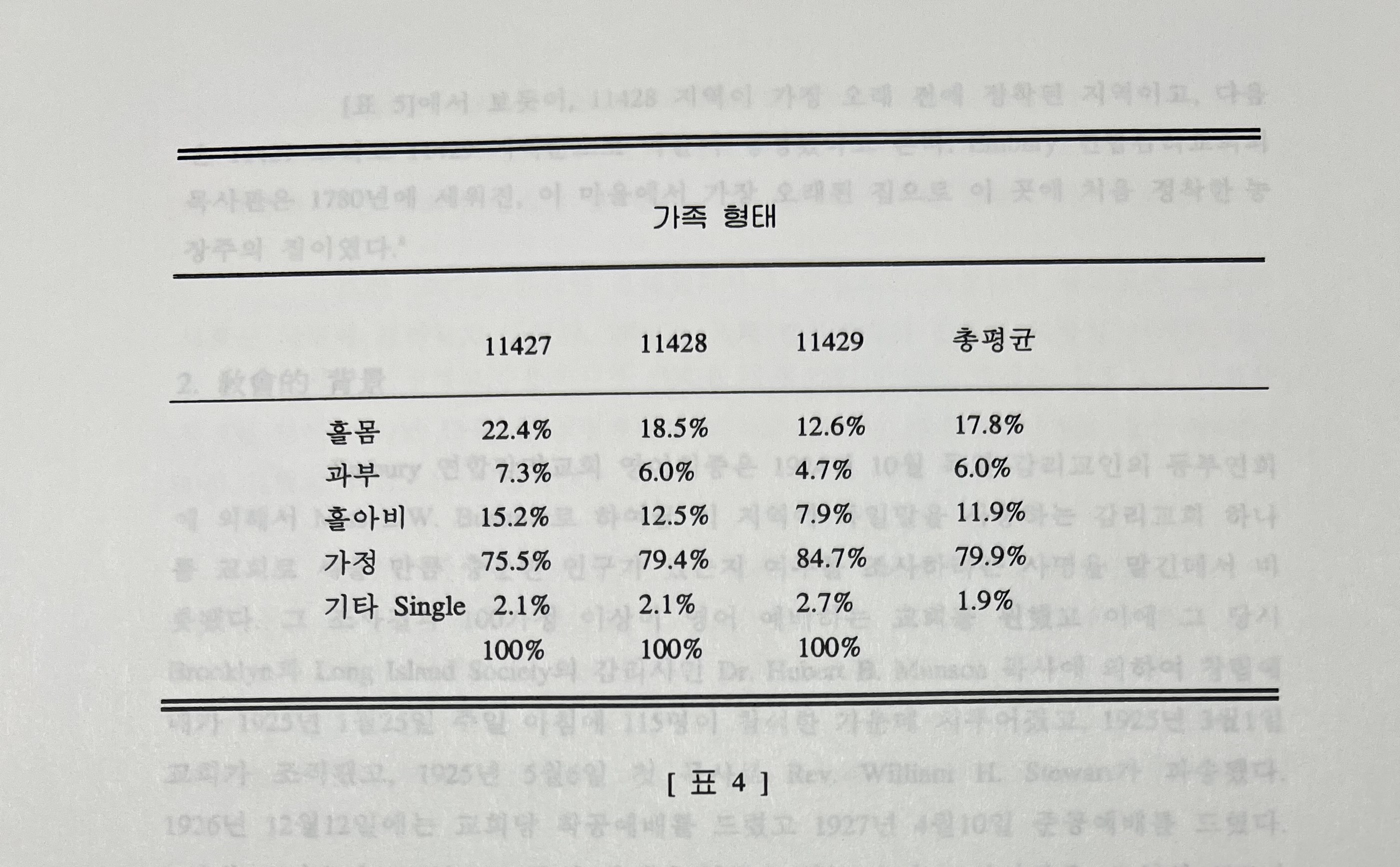 [표 1]에서 보듯이 평균 나이가 35.6세에서 37.7세로 2.1세로 나이가 들어 감을 알 수 있다. 그러나 [표 2]에 나타나듯이, 교회가 위치한 11427과 11428 지역에 는 65세 이상되는 노인이 20.1%와 14%의 인구로 11429지역의 9.7%에 비교하면 2 배 이상의 노인 인구가 많은 것을 알 수 있다. 또한 [표 3]에서 보듯이 인종비율이 교 회가 위치한 11427과 11428은 백인이 76.8%와 75.7%인 반면 11429지역은 흑인이 77.5%로서 상반된 현상이 지역에 따라 한 마을에 나타나있다. 교회에서 한 불럭에 있는 Jamaica Avenue 남쪽 건너편부터 시작되는 11429 지역에는 흑인인구가 집중해 있는 지역이다.