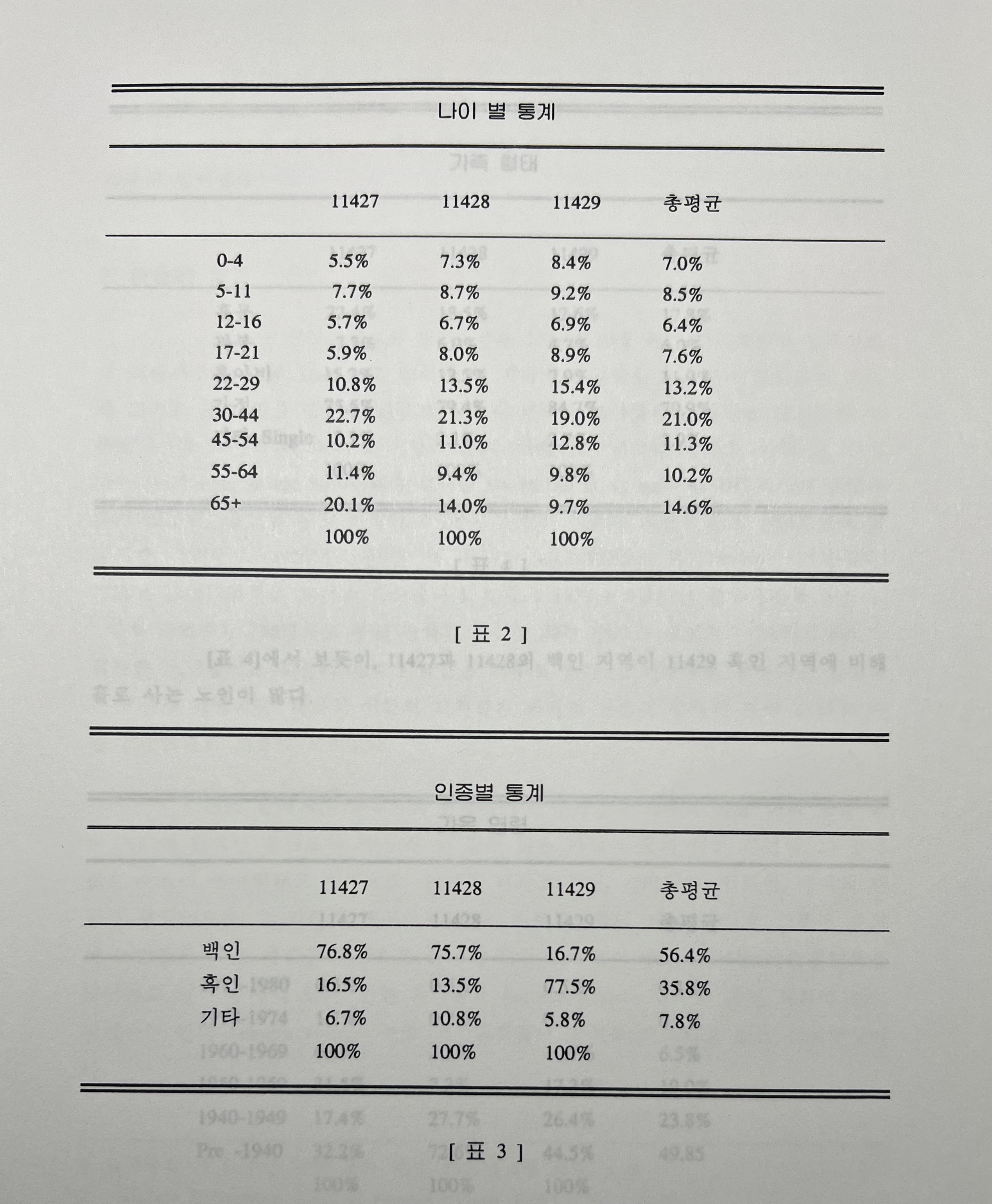 [표 4]에서 보듯이, 11427과 11428의 백인 지역이 11429 흑인 지역에 비해 홀로 사는 노인이 많다.