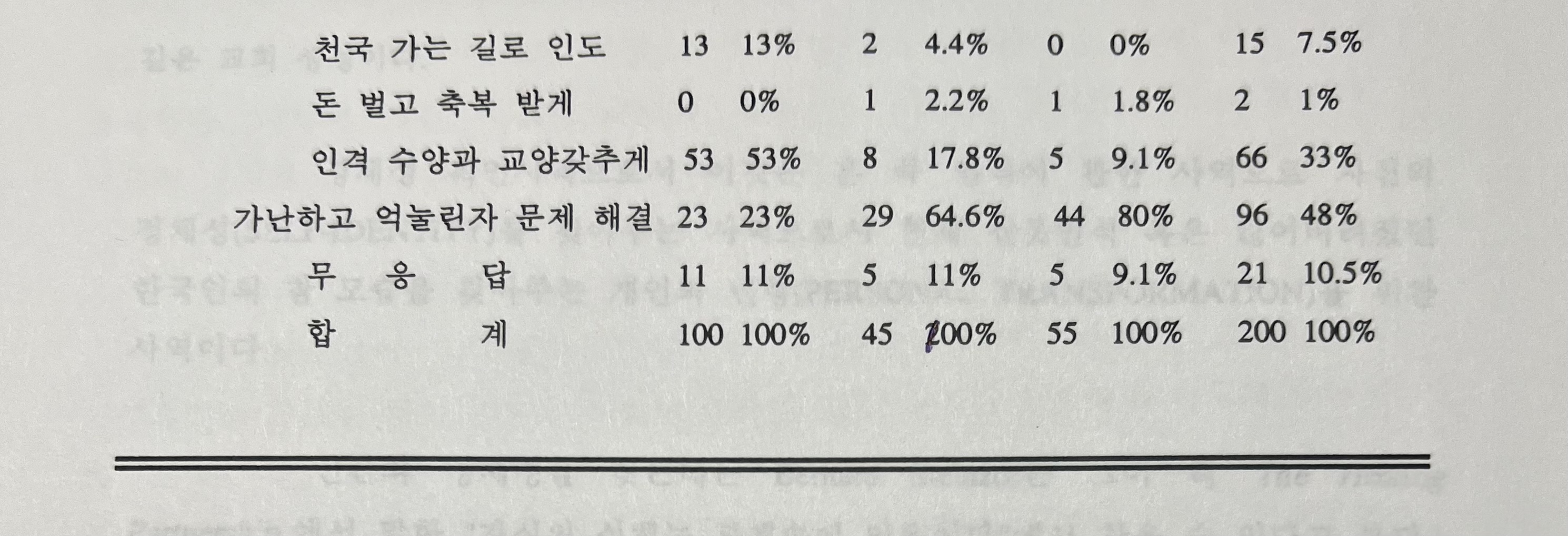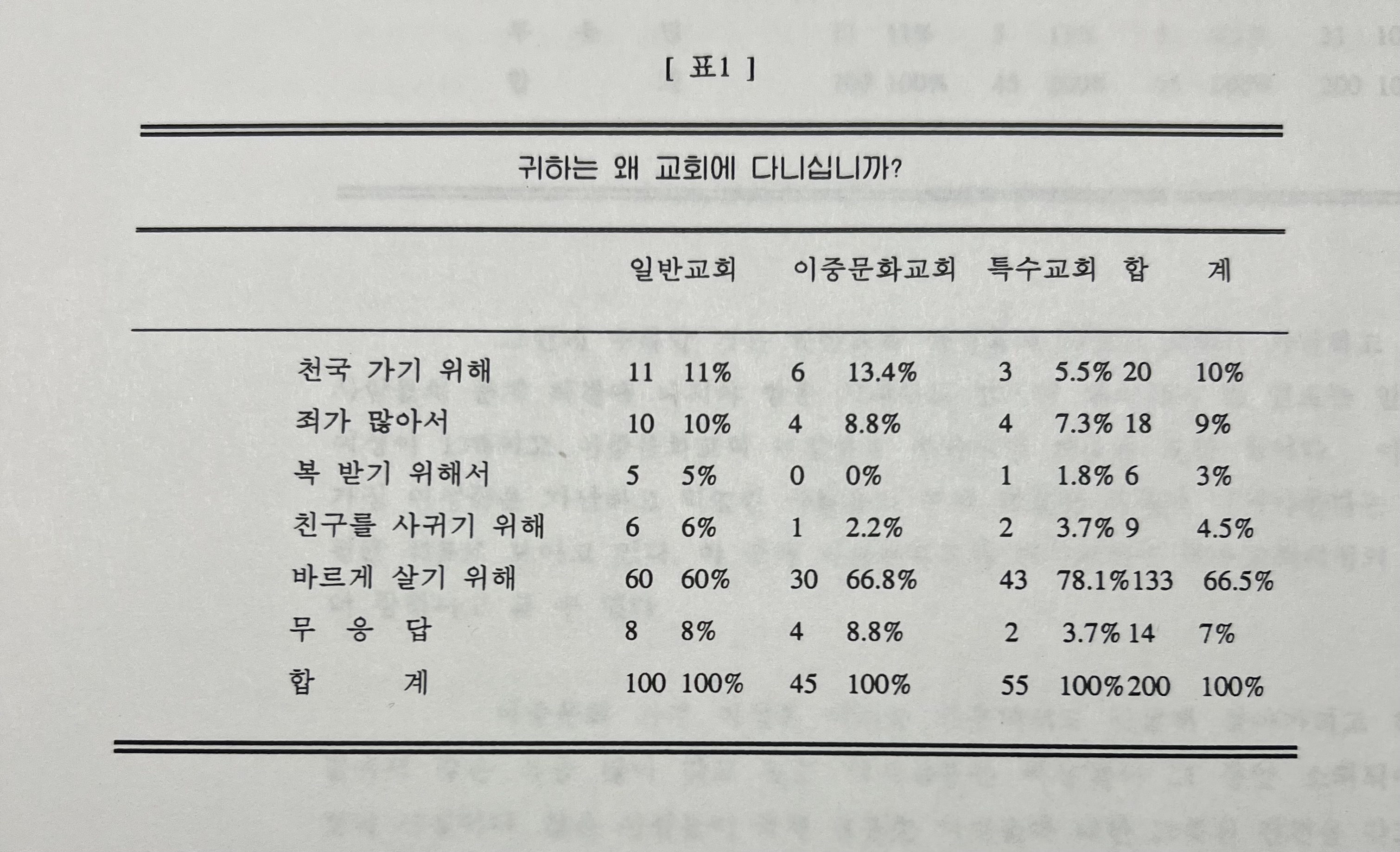세 유형 교회 여성들 절대 다수가 ‘바르게 살기 위해서’ 교회에 다닌다고 응답하고 있는데 그 강도는 일반교회 여성(60%), 이중문화교회 여성 (66.8%), 특수교회 여성(78.1%) 순이다. 특기할 점은 특수 교회 여성이 ‘천국에 가기 위해’ ‘죄 때문에’, 두 합계비가 12.8%인데 비해 일반교회 여성 21%, 이중문화교회 여성 22.2%로서 전통적 신앙의 경향이 두드러져 보인다.