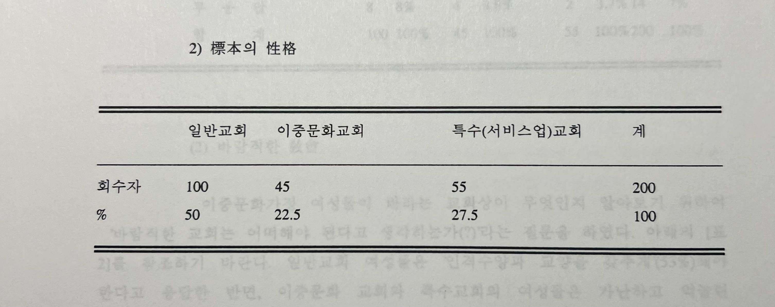 이러한 이중문화 여성들의 (1) 자영, 사업과 전문직, (2) 단순노동 (3) 맛사지 팔러로 분류된 구릅이 교회에 대하여 어떻게 의식하고 있는지를 조사해보는 것이, 이들을 이해하는데 대단히 중요한 자료가 되리라본다.