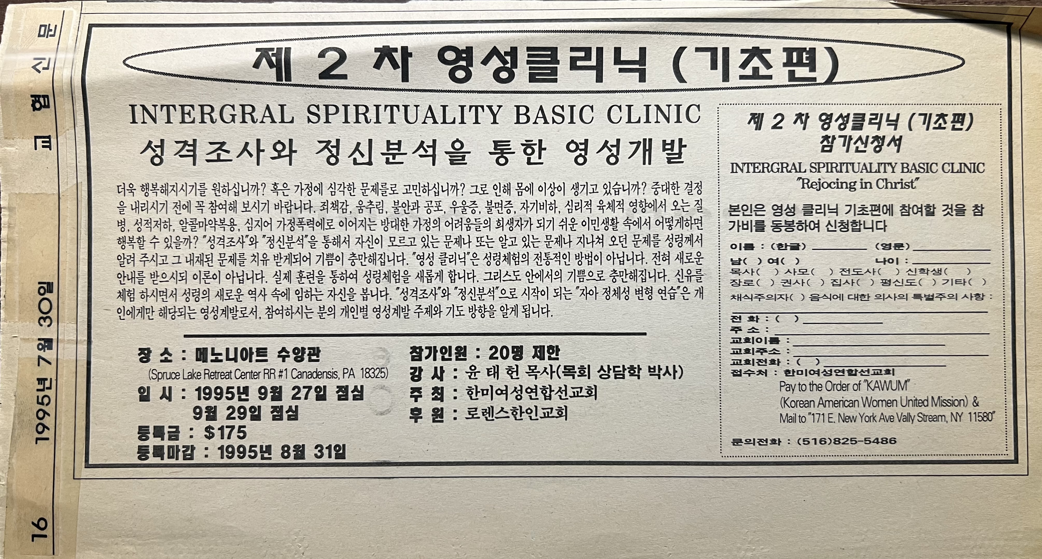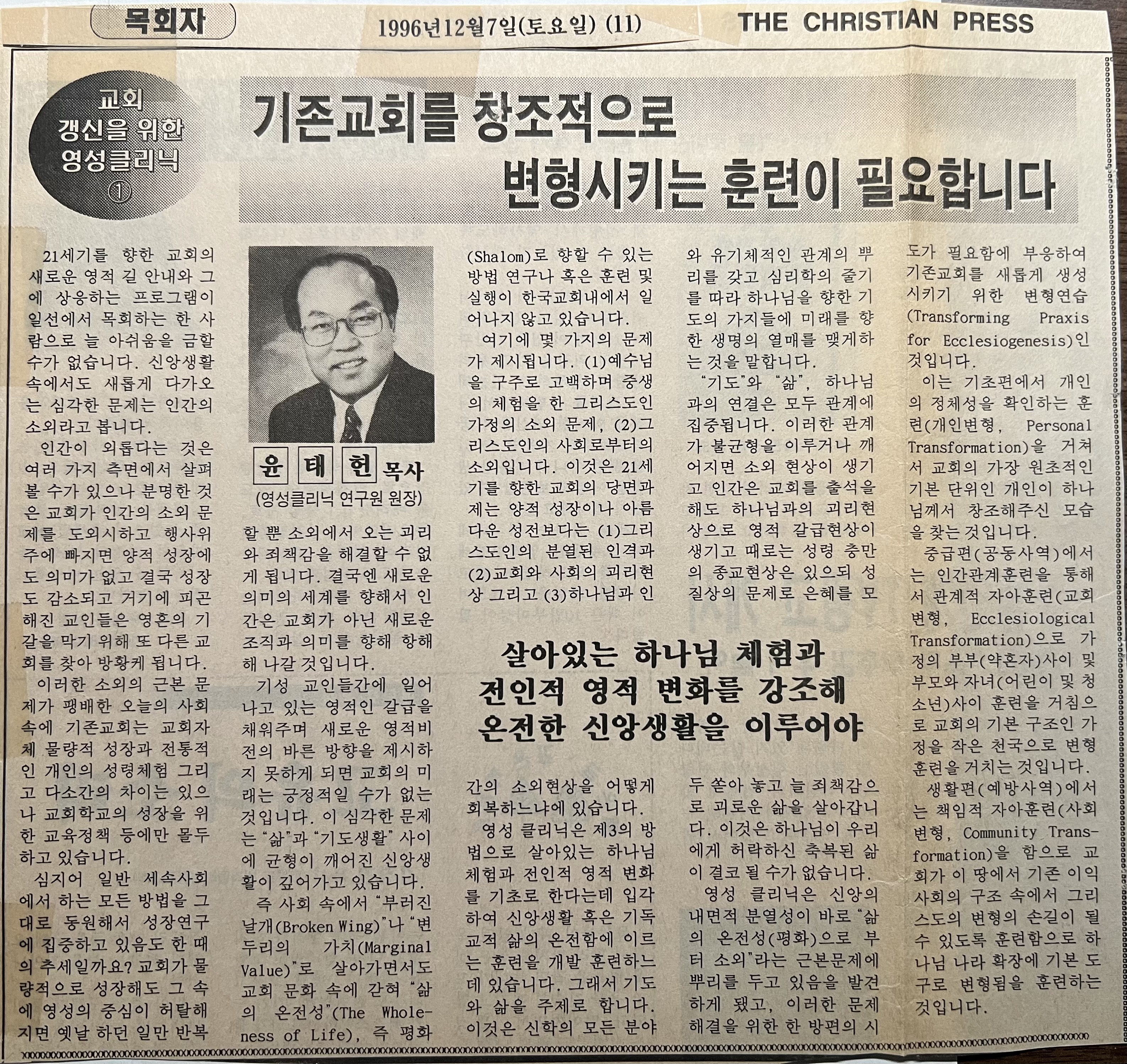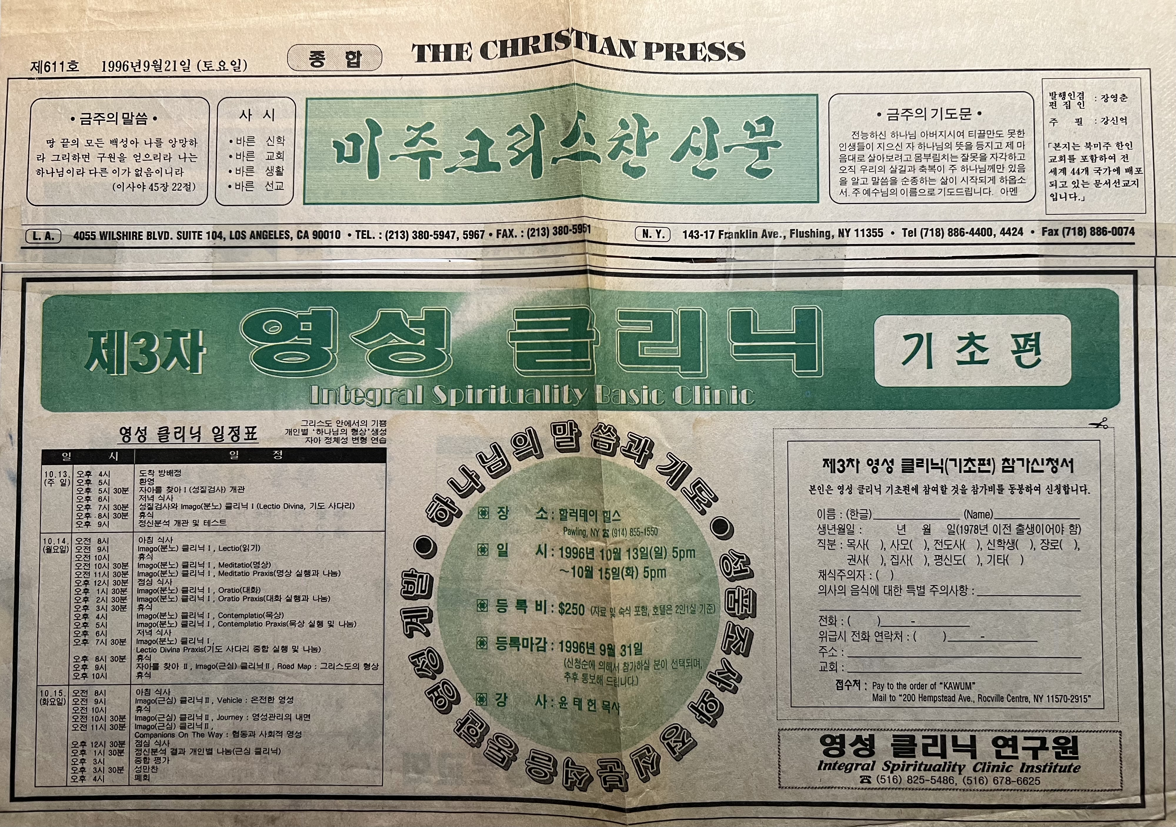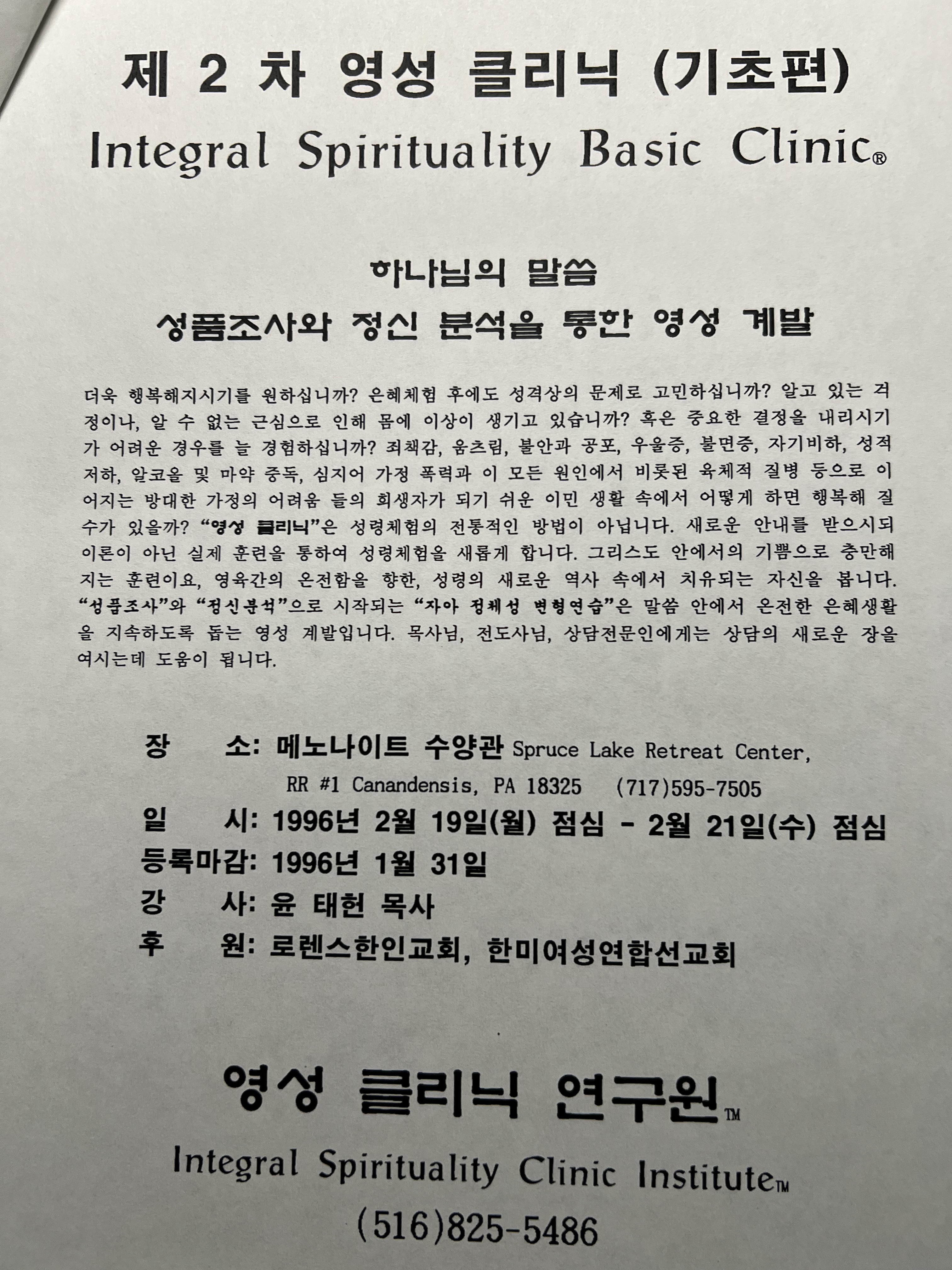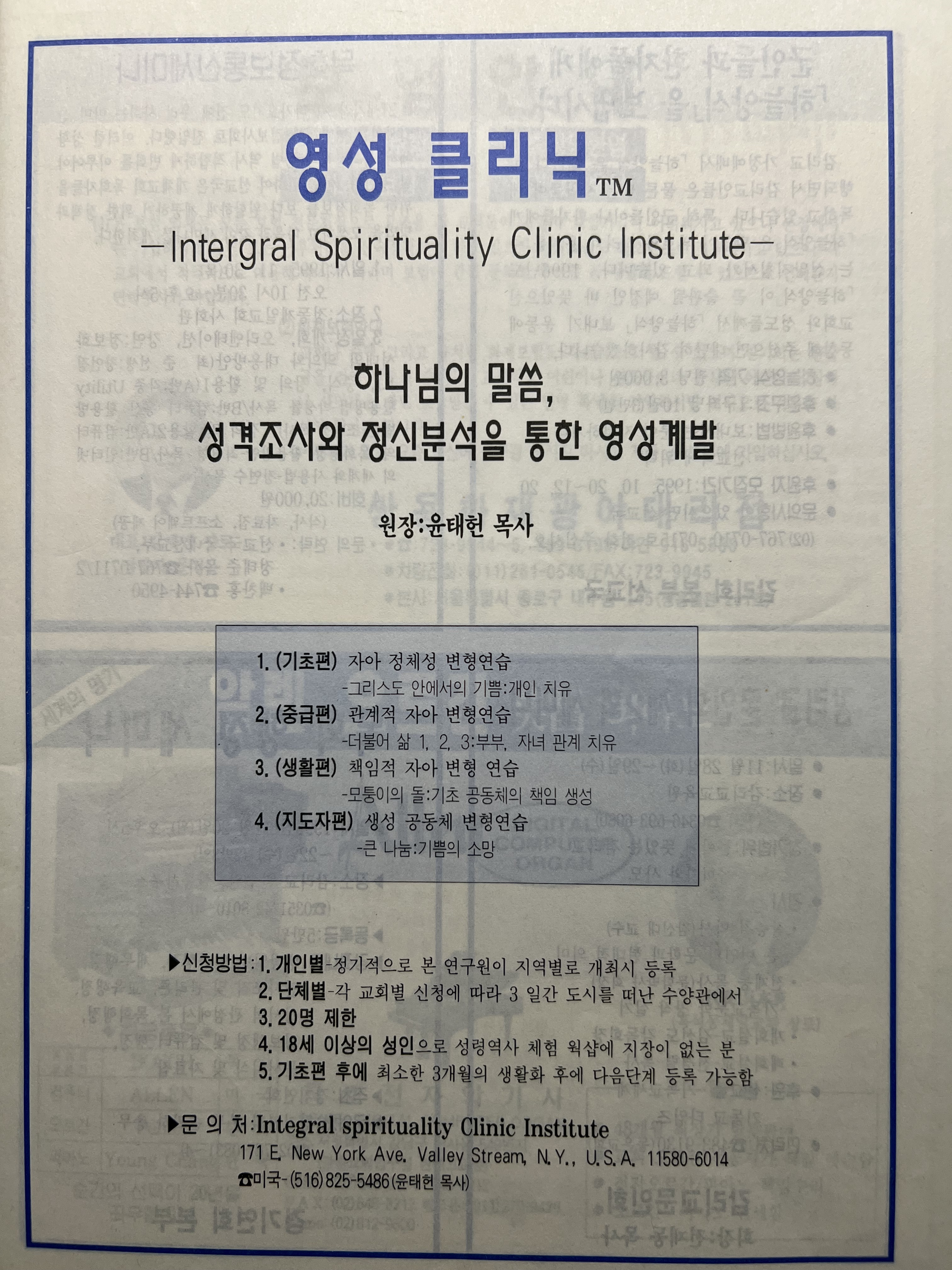 “영성 클리닉(Integral Spirituality Clinic 은 ‘불확실의 시대’를 살아가는 현대인 에게 그리스도 안에서 ‘삶의 기쁨’을 풍성히 누릴 수 있음을 알려주고 훈련 시켜 주는 프로그램이다. 하나님께서 에덴 동산을 만드시고 인간들에게 허 락하셨던 삶은 ‘보시기에 아름답고’ 건강하고, 존귀한 삶이었다. 바로 이런 삶을 꿈꾸고 이 세상에서 맛보며 살아 가도록 돕고자 하는 프로그램이 바로 “영성 클리닉”이다. 이를 통해 교회가 건강해지고 성장할 줄로 믿는다.