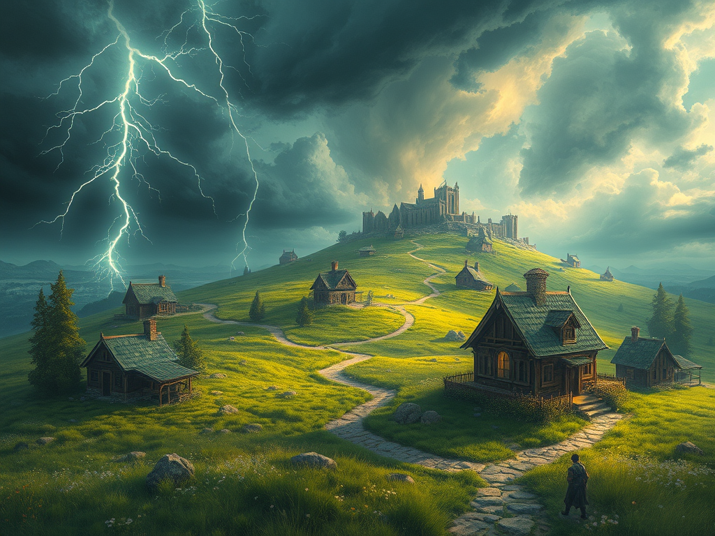 Lightning split the sky— and the earth, pale blue and yellow, wore the face of a weary child.