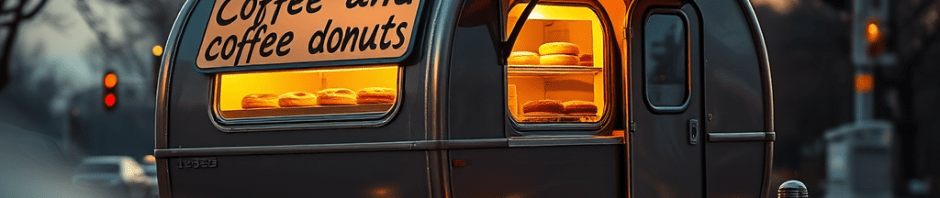 회색 승용차에 소형 트레일러를 달았는데, 커피와 도넛을 팝니다” 라는 표지를 해놓고 있었습니다. 트레일러에는 알루미늄으로 짠 선반 이 있고 그 안에는 작은 전구가 훤하게 켜져 있어, 뜨거운 커피와 도넛 이 저절로 생각나곤 하였습니다.